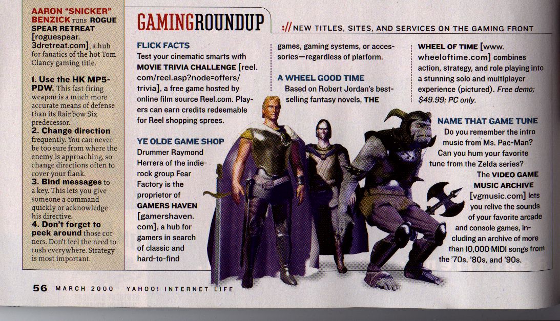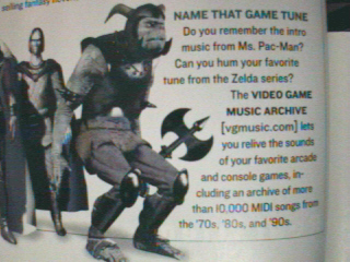 Videogame Music Archive mentioned on Page 56 in the March 2000 issue of Yahoo Internet Life Magazine. Two scanned versions of the article are available online: Small Version (83KB) and Large Version (221KB)